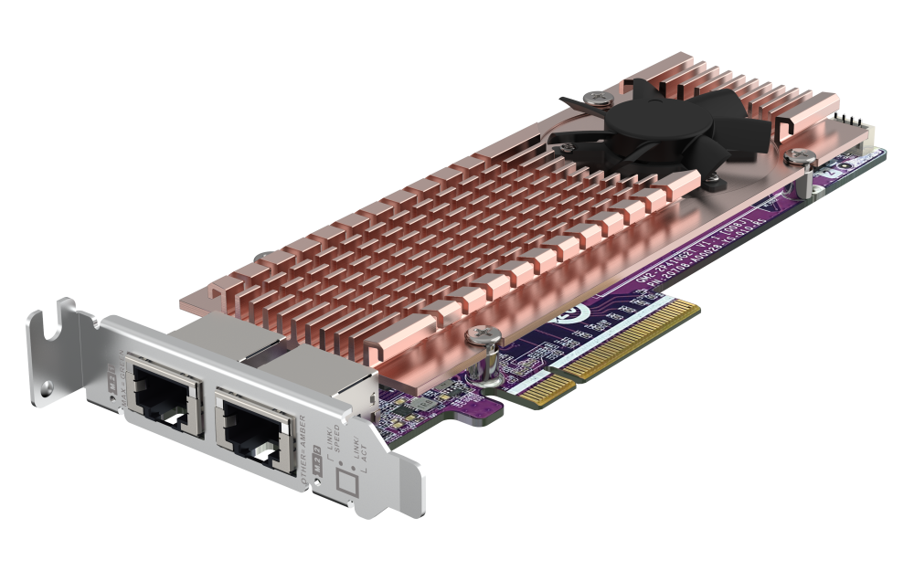 La QM2-2P410G2T le permite añadir fácilmente SSD M.2 NVMe y conectividad RJ45 10GbE a su PC/estación de trabajo. La QM2-2P410G2T incluye un controlador Broadcom®, y la interfaz PCIe 4.0 ofrece un mayor ancho de banda para proporcionar una mayor velocidad de procesamiento y un acceso más rápido a los datos.