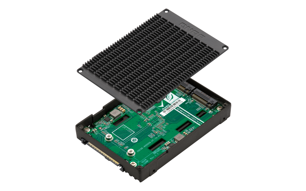 El QDA-U2MP admite dos SSD M.2 PCIe 3.0 x4 NVMe en una bahía para unidades SSD U.2 (SFF-8639) PCIe 3.0 x4 NVMe de 2,5". No se necesita ningún controlador de software para el QDA-U2MP y se puede instalar en un PC/estación de trabajo (Windows®, Linux®) o en un NAS de QNAP para reemplazar a una costosa SSD U.2 por varias SSD M.2 más asequibles.