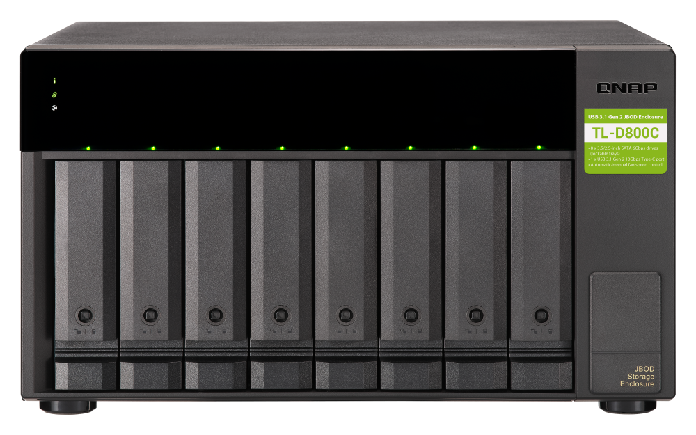 La caja de almacenamiento JBOD TL-D800C le permite hacer copia de seguridad y expandir sus unidades NAS de QNAP. El TL-D800C incluye ocho bahías para unidades SATA 6Gb/s de 3,5 pulgadas con conectividad USB 3.2 Gen2 (10 Gbps) Tipo-C para ofrecer una solución de expansión rápida y fluida.