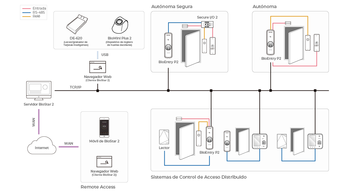 BioEntry P2 no solo viene con una interfaz TCP/IP, sino también con más interfaces tradicionales (RS-485, Wiegand) para proporcionar mayor flexibilidad y múltiples opciones de instalación para diferentes entornos. También ofrece 2 entradas internas y 1 salida de relé interna para el control de dispositivos periféricos. Los puertos de E/S pueden expandirse con el accesorio Secure I/O.