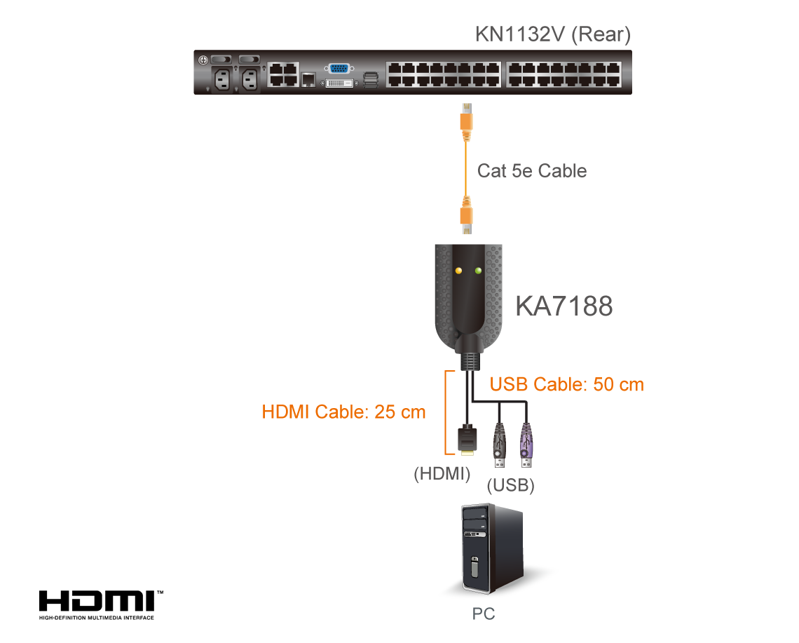 El cable adaptador KVM KA7188 conecta un switch KVM a los puertos de vídeo HDMI y USB del ordenador de destino.* El KA7188 admite salida HDMI e incorpora dos puertos USB para conectar a un ordenador de destino para teclados y ratones, función Virtual Media y función de lector de Smart Card/CAC.**