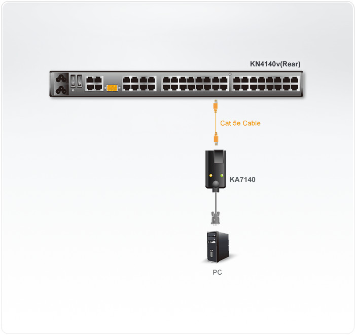 El Cable Adaptador Serial Altusen KA7140 conectado a un Switch KVM permite controlar dispositivos seriales a través de puertas seriales. Este adaptador es liviano y presenta un tamaño compacto, ideal para montaje en rack o en servidores de escritorio.