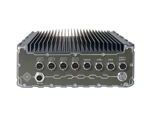 Ordenador resistente al agua IP67 de medio rack compatible con procesadores Intel® Xeon® E o Core™ de 9.ª/8.ª generación con 4 puertos M12 PoE+, UPS SuperCAP y puerto de 10 GbE
