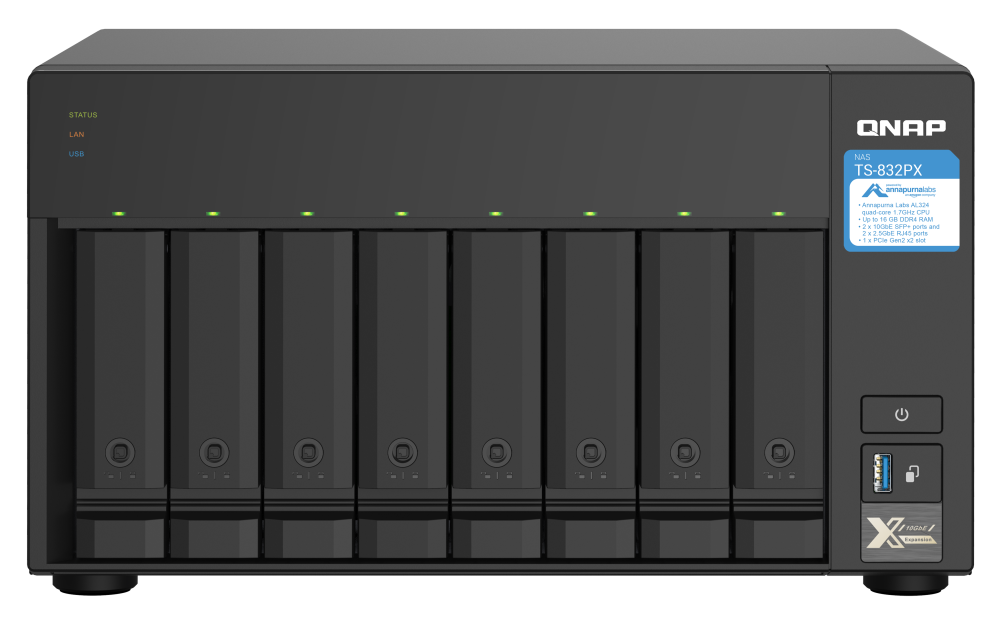 El TS-832PX de cuatro núcleos a 1,7 GHz incluye ocho bahías de unidades SATA de 3,5" a 6GB/s, lo que ofrece enormes capacidades de almacenamiento para una amplia gama de aplicaciones y el uso diario. Con dos SFP+ 10GbE y dos puertos LAN 2,5GbE, el TS-832PX admite redes de próxima generación para permitir el uso de aplicaciones que requieren un alto ancho de banda y ofrecer un acceso y un uso compartido de archivos más fluido. También son compatibles diversas tarjetas PCIe, incluyendo tarjetas QM2 que ofrecen caché SSD M.2 SATA/NVMe y almacenamiento con organización automática por niveles Qtier™ para mejorar el rendimiento del NAS.
